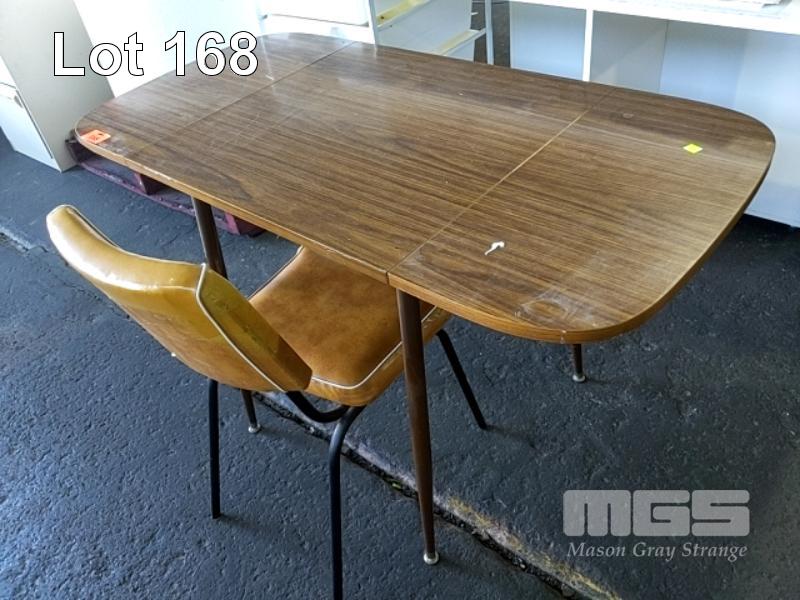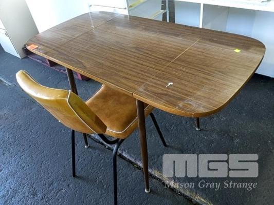 DROP SIDE DINING TABLE, TIMBER LAMINATE TOP WITH BLACK METAL FRAME DINING CHAIR