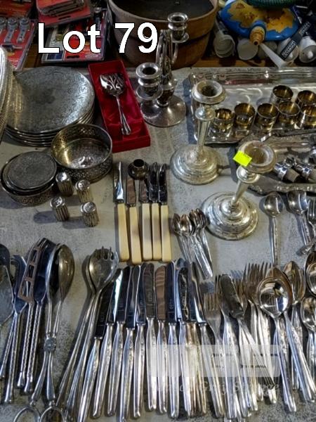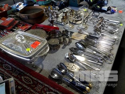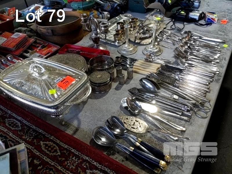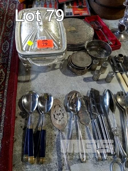 ASSORTED CUTLERY, CHAFFER DISH & CANDELABRA, ETC
