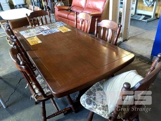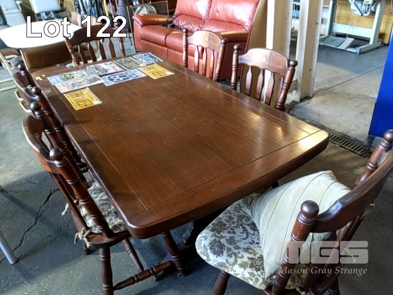 DINING SUITE, 7 PIECE COMPROMISING, SOLID TIMBER RECTANGULAR TABLE & 6 x COLONIAL STYLE DINING CHAIRS