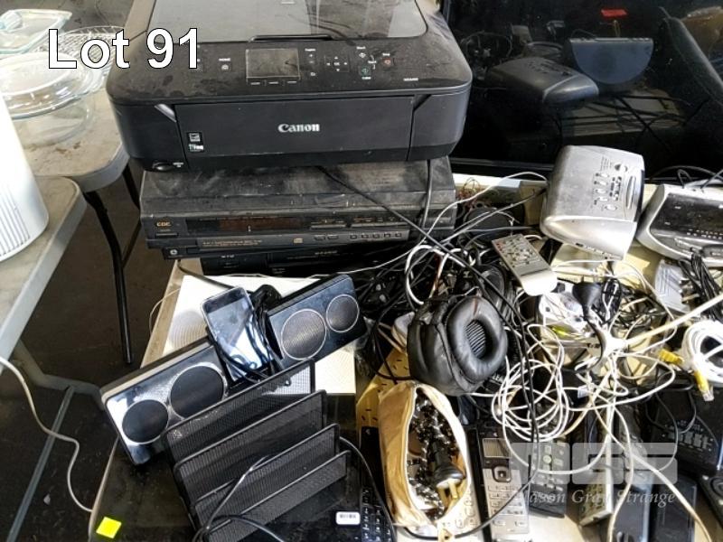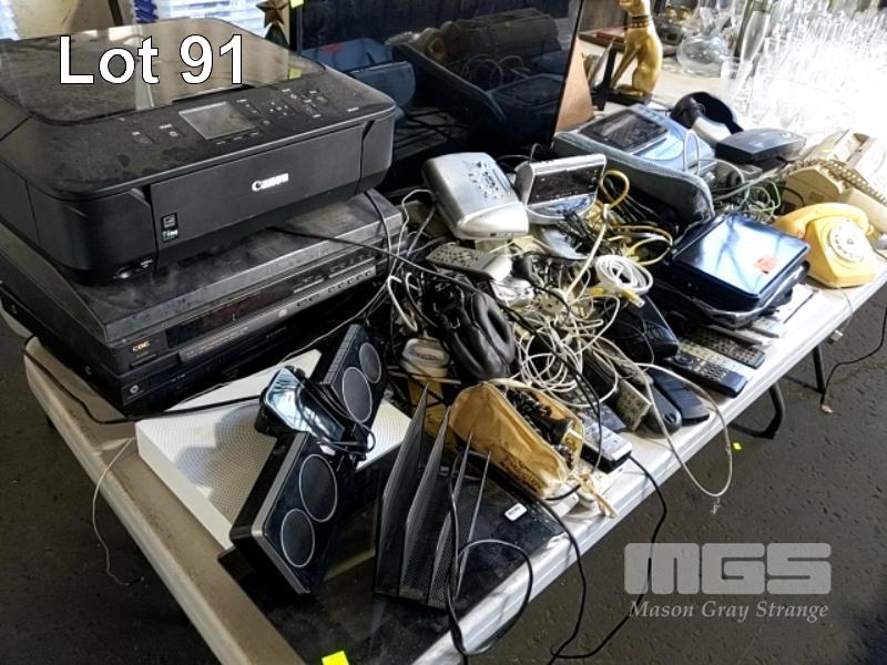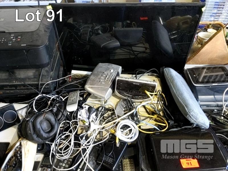 SONIQ 32" HD LED LCD TV, VCR, TURNTABLES, TELEPHONES, REMOTES, ETC, 1 x TABLE