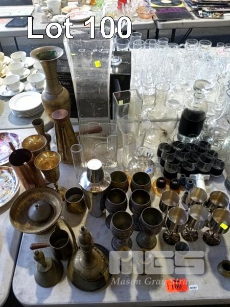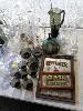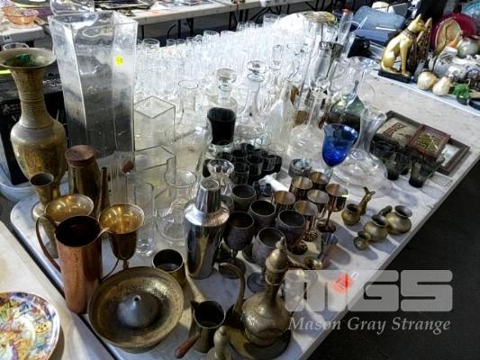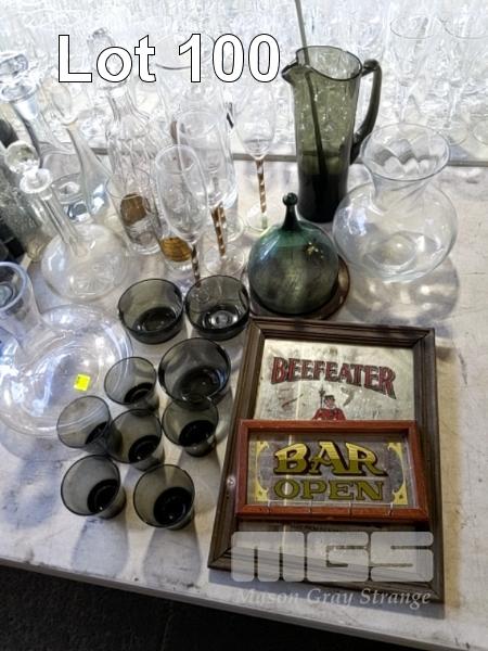 ASSORTED EPNS & PEWTERWARE, COLOURED GLASS, VASES, COPPERWARE, BAR MIRROR ETC