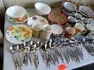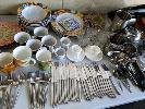 ASSORTED KITCHENWARE, CERAMIC PLATES, BOWLS, CUPS & CUTLERY