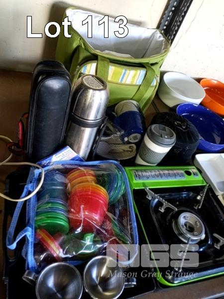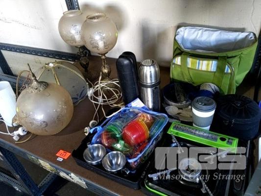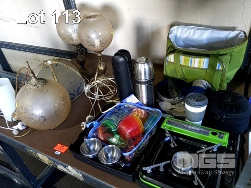 ASSORTED HOMEWARES, LIGT FITTINGS & LAMPS, THERMOS, GAS CAMP STOVE, COOLER BAG ETC