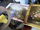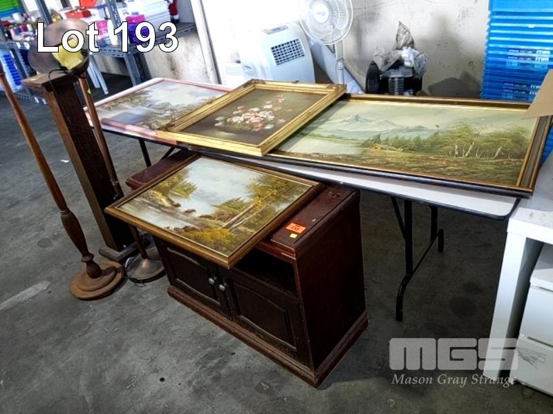 ENTERTAINMENT UNIT, TIMBER POT STAND, FRAMED PRINTS, LAMP ETC.