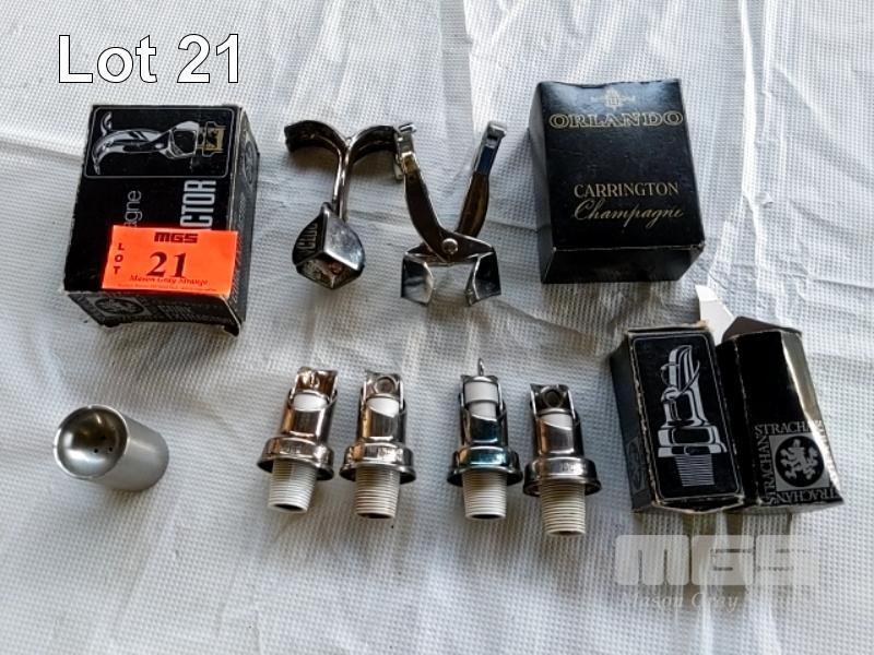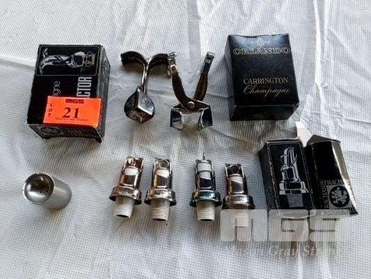 2 x CHAMPAGNE CORK EXTRACTORS. 4 x STRACHAN CORK MOUTH WINE BOTTLE POURERS ETC.