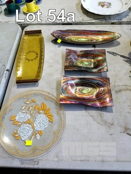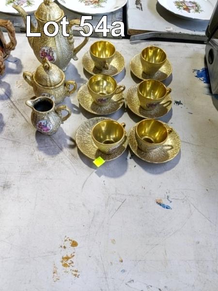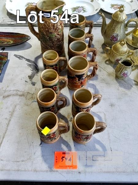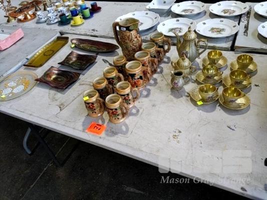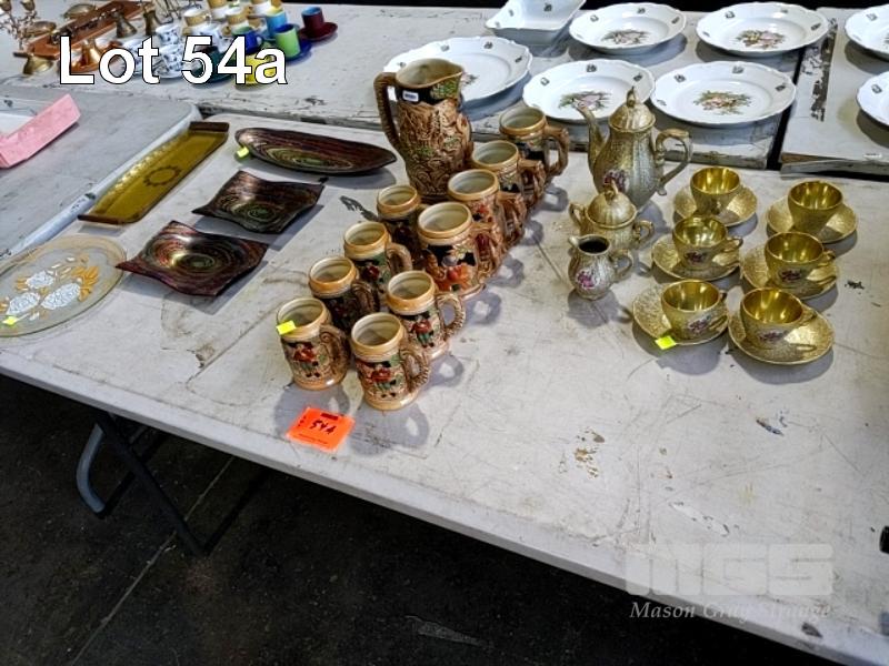 GOLD GILT TEA SET, ASSORTED BEER STEINS & GLASS TRAYS