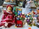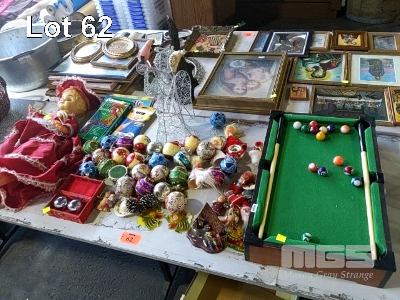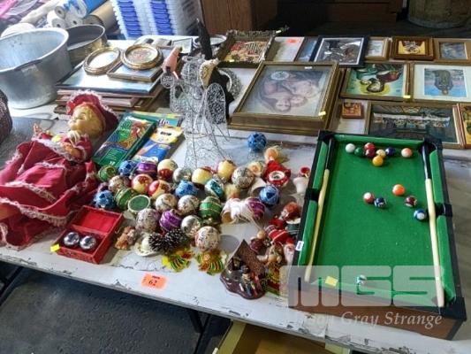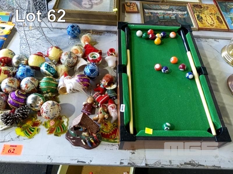 MINIATURE POOL TABLE, CHRISTMAS DECORATIONS, DOLL, ETC