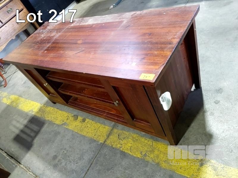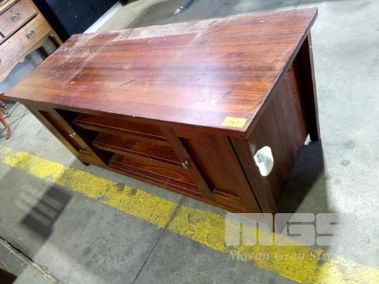 TIMBER LOWLINE TV CABINET, TWO DOOR WITH PULL-OUT MEDIA STORAGE DRAWS BEHIND DOORS.