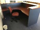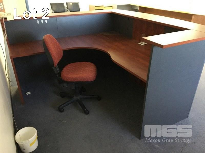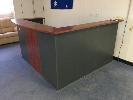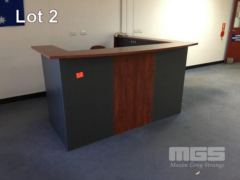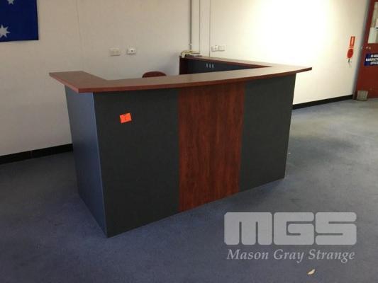 RECEPTION COUNTER, L-SHAPE, MAPLE/STORM TIMBER LAMINATE, 2000 x 2000mm WITH CLOTH GAS LIFT CHAIR, BLACK FRAME