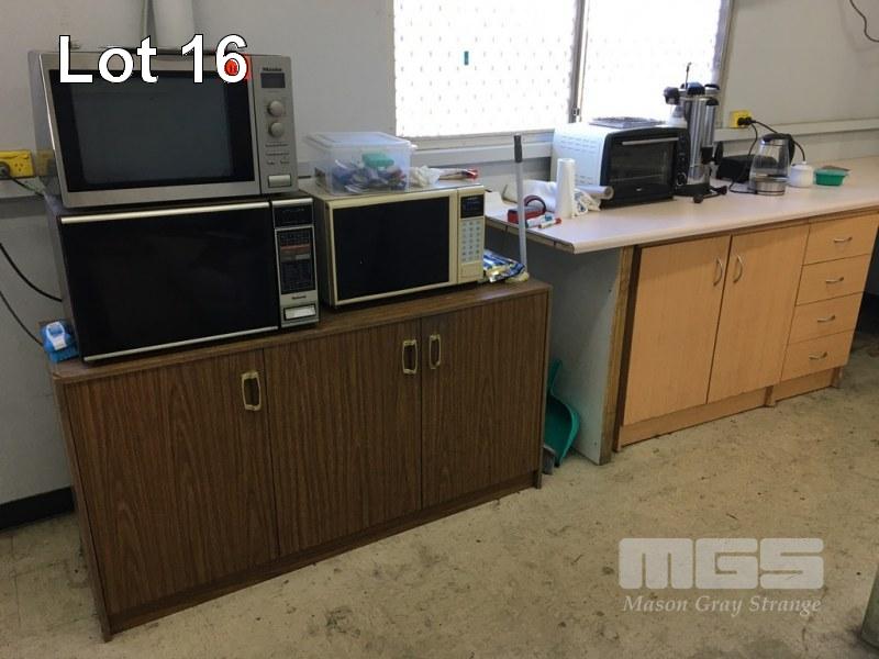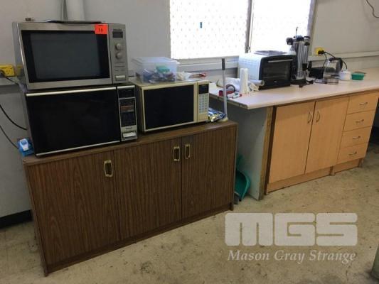 3 x MICROWAVES, MIELE, NATIONAL, COOKWELL TOASTER OVEN, CABINET & CONTENTS, CUTLERY, GLASSWARE, CROCKERY, ETC