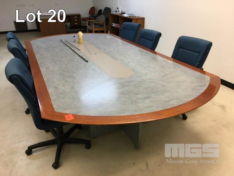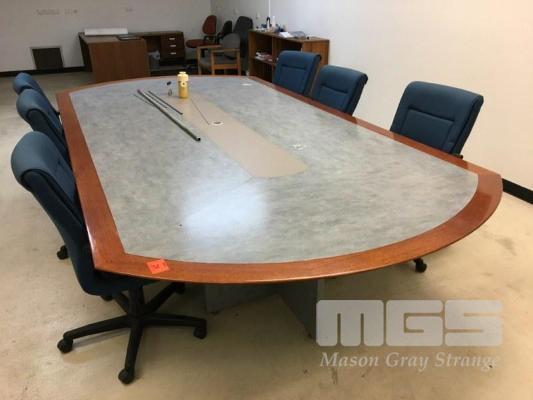 SOLID TIMBER, VINYL INLAY BOARDROOM TALE, 3600 x 1800mm WITH 7 x MATCHING CLOTH BOARDROOM CHAIRS