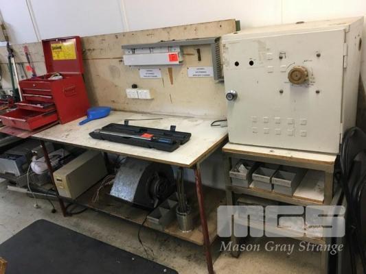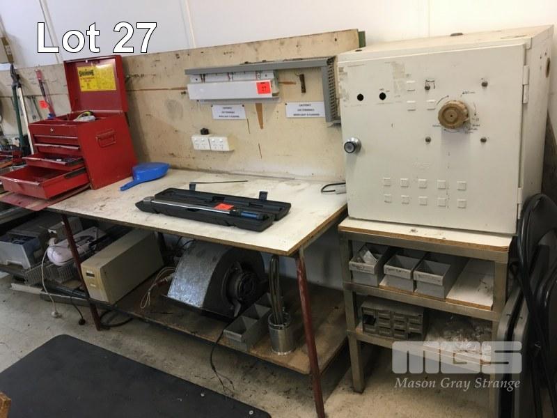 ELECTRICIANS TEST BENCH, 3000 x 750mm & VARIAC SLIDER, 0-250VOLT SEC 240V PRIMARY & SMALL STAND & CONTENTS LOWER SHELF