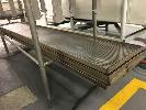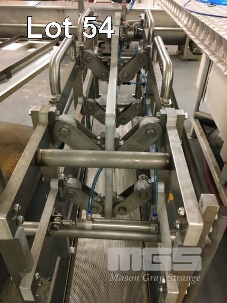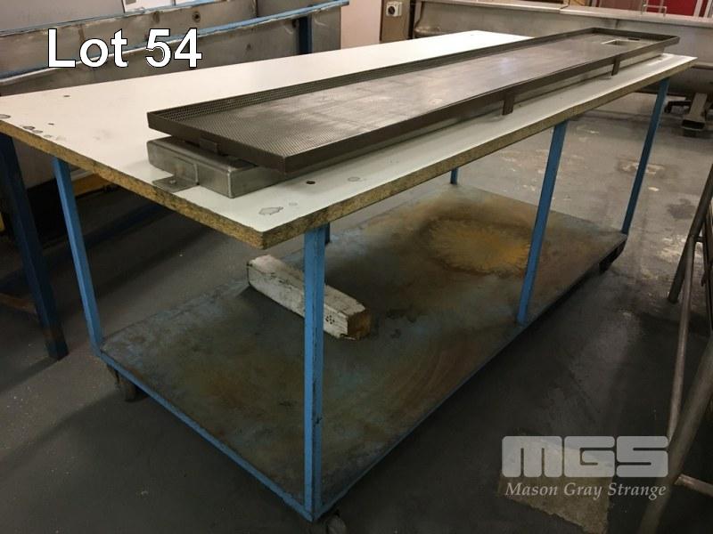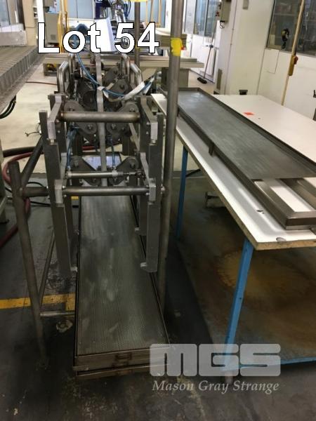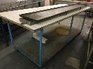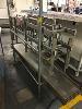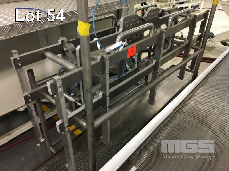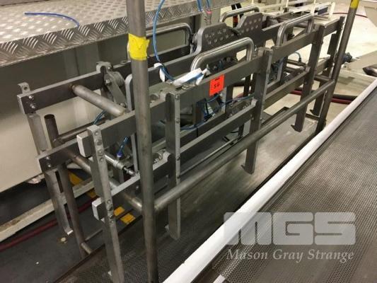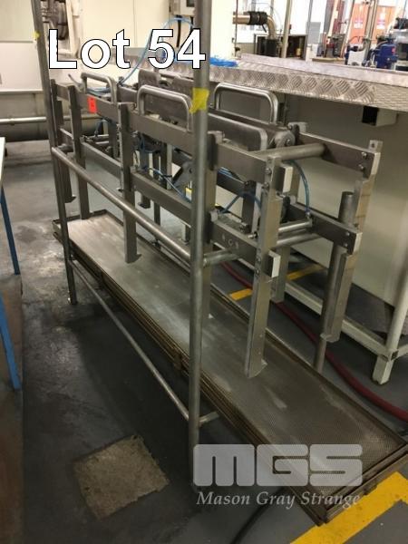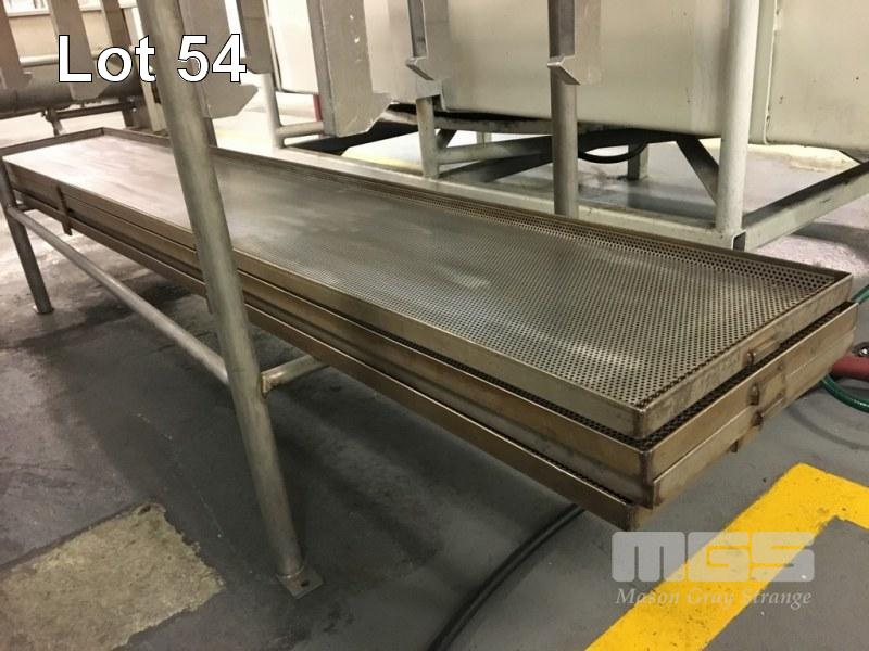 STAINLESS STEEL PNEUMATIC LIFTING GRAB WITH 5 x STAINLESS STEEL DRAINAGE TRAYS, ON STAINLESS STEEL STAND & MOBILE STACKING TABLE, 2100 x 900mm
