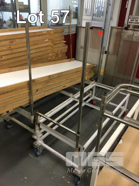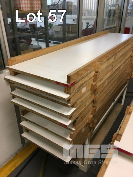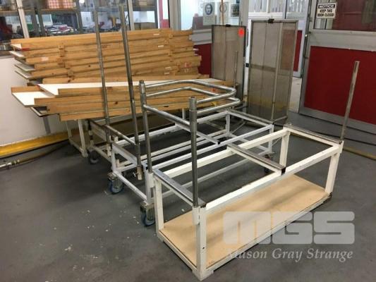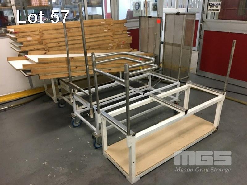 15 x TIMBER PRODUCT TRAYS, 1800 x 450mm & 2 x MOBILE TROLLEYS & STANDS