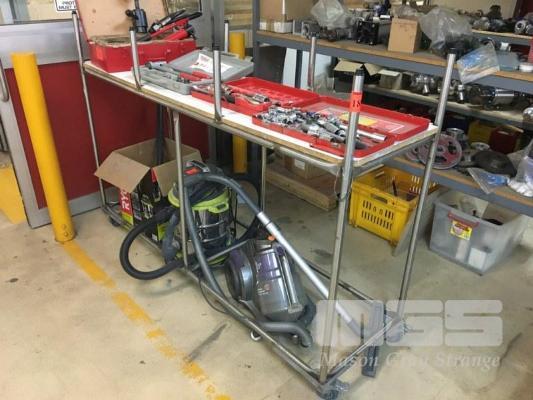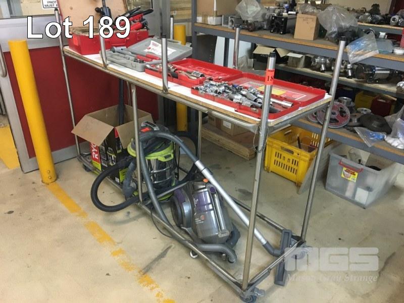 LARGE MOBILE LAYOUT BENCH, STEEL FRAME & PARTICLEBOARD TOP, 2400 x 1200 x 800mm & STAINLESS STEEL STOCK TROLLEY, 1700 x 500 x 1000mm