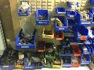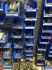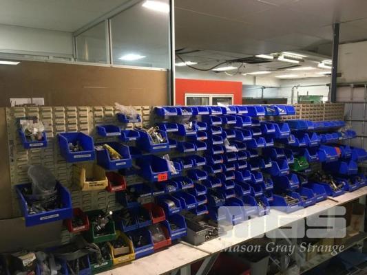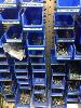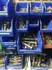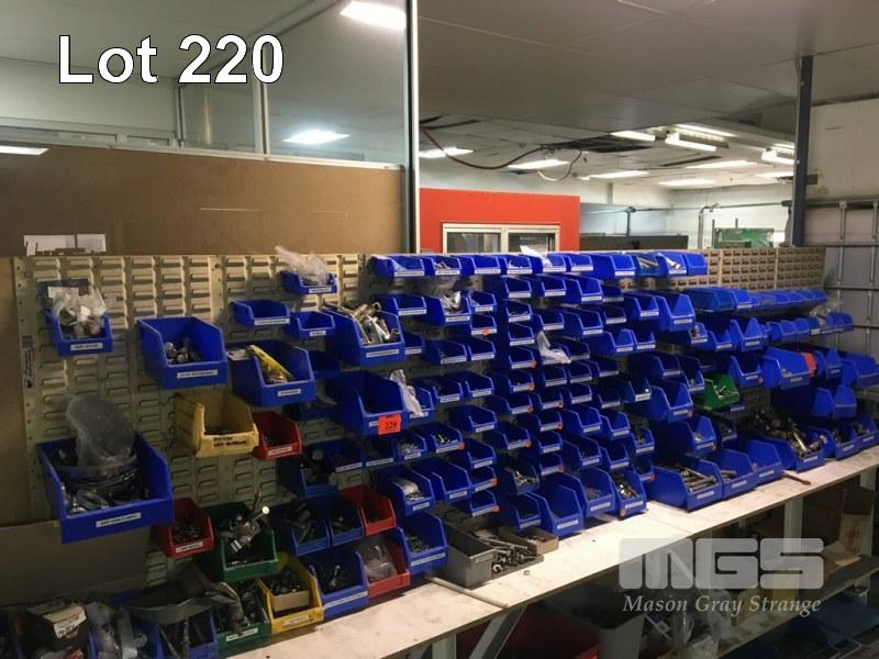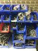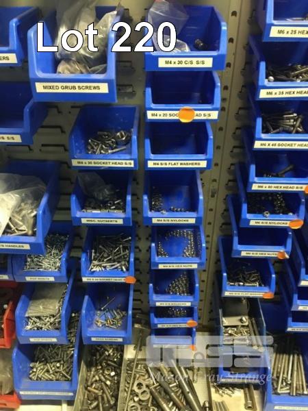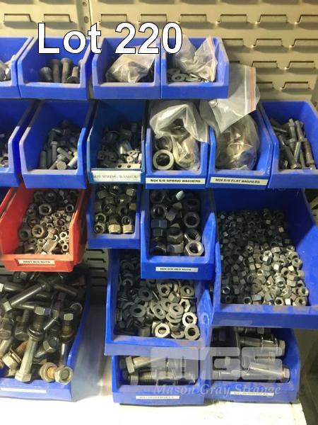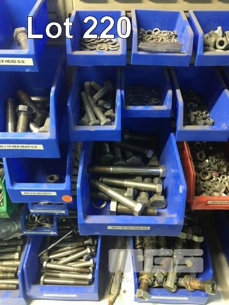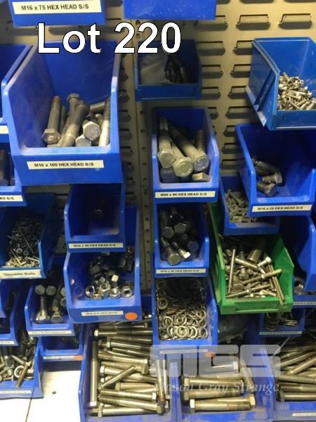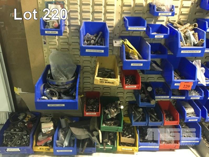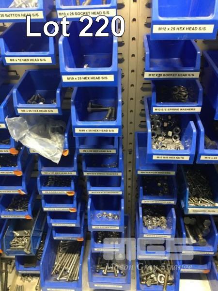 LARGE QUANTITY PLASTIC PARTS BINS, WALL RACK & CONTENTS, VARIETY STAINLESS STEEL BOLTS, NUTS & WASHERS, NYLOC, GALV, BLACK STEEL, BOLTS, ETC