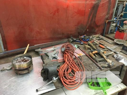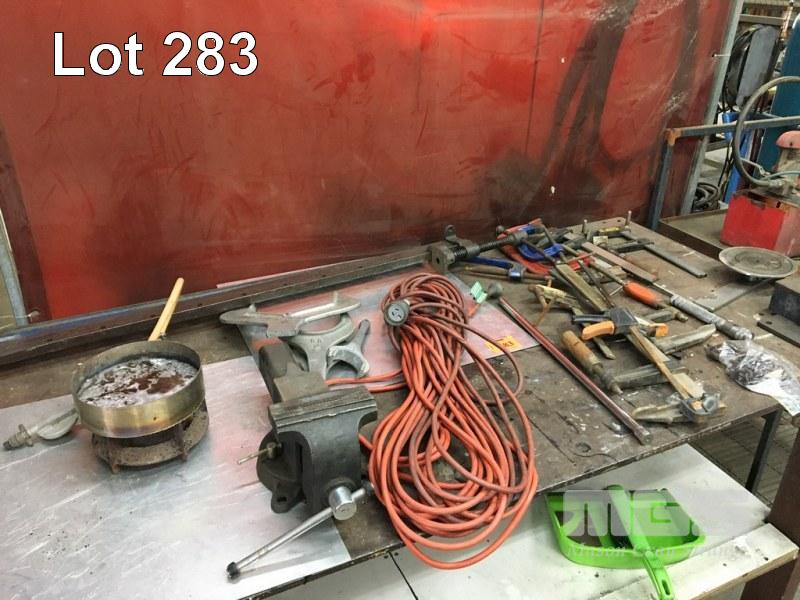 2 x BAR CLAMPS, 6" (150mm) BENCH VICE, LEAD MELT POT, EXTENSION CORD, LARGE SPANNERS & G & F-CLAMPS