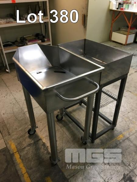 2 x STAINLESS STEEL OPEN TOP TANKS ON STANDS w DRAIN HOLES