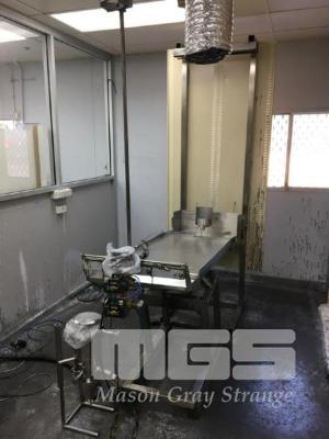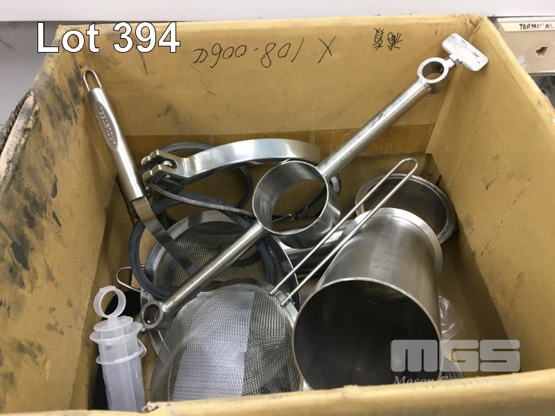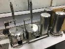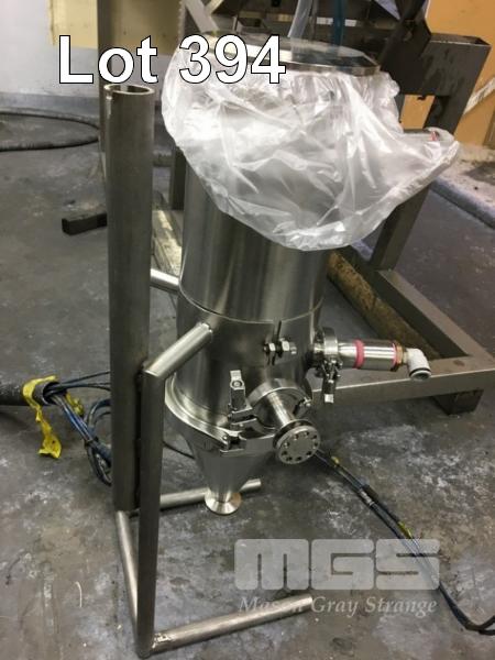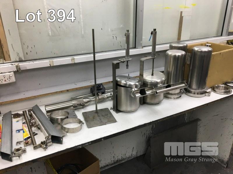 FABRICATED STAINLESS STEEL COATING STAND w DRAIN TRAY, 120psi INJECTORS, LARGE QUANTITY STAINLESS STEEL POTTS AND FITTINGS ON SIDE RACK