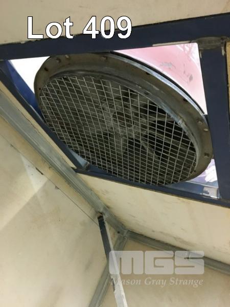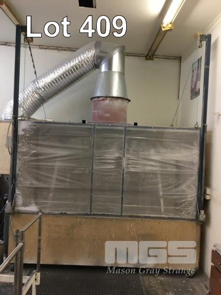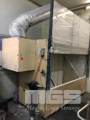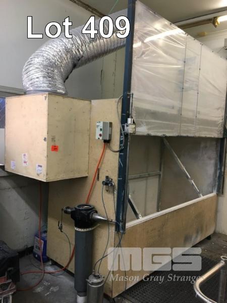 FABRICATED MEMBRANE TRAY SPRAY BOOTH COUNTER WEIGHTED LIFT UP ACCESS PANEL DIMENSIONS 2500 x 2000 x 1100mm ANGLE TRAY HOLDING FRAME PLYWOOD PANEL, SEEL FRAME AND 415v FAN EXTRACTION (MOBILE)