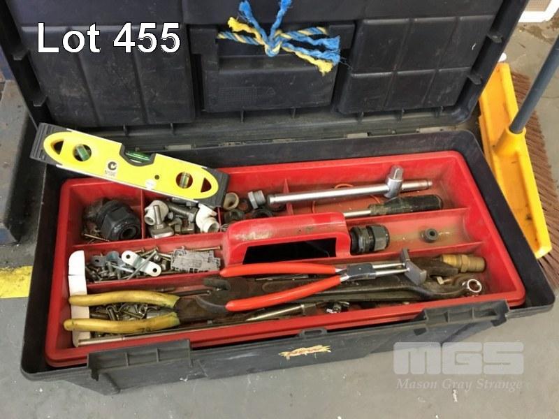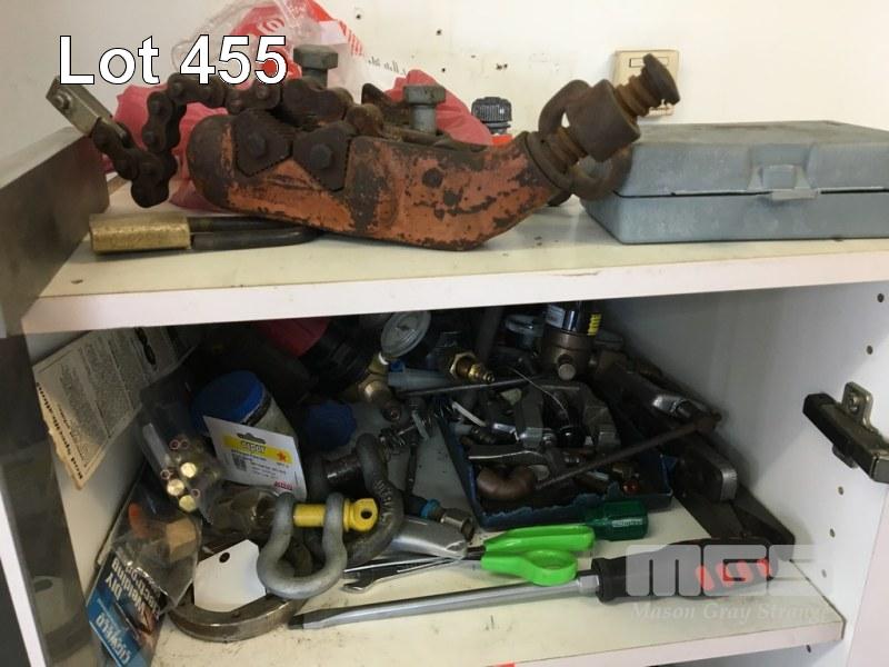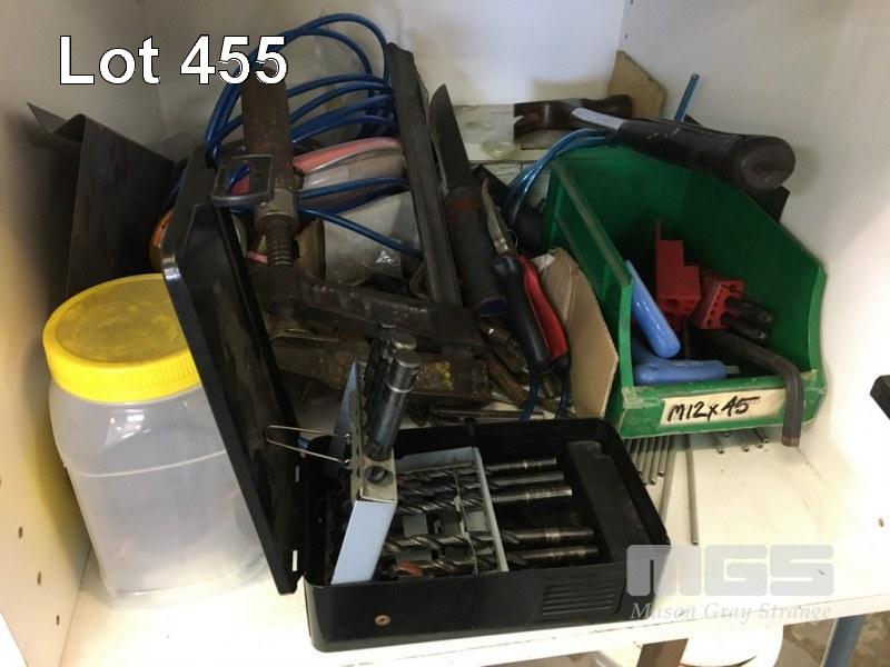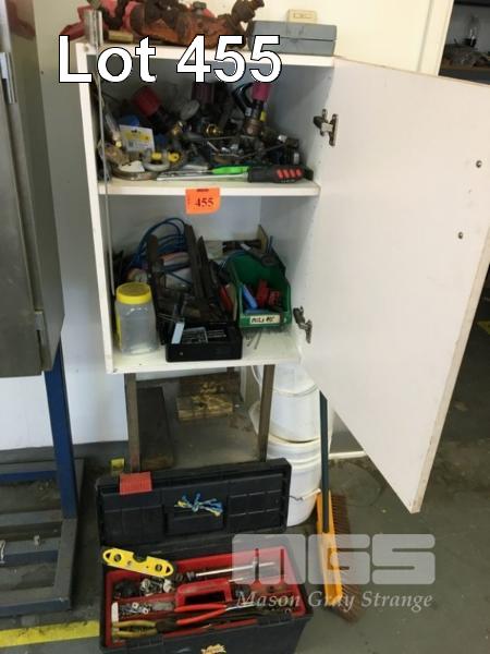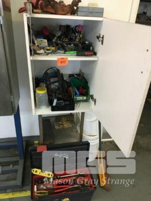 ASSORTED HAND TOOLS AND TOOL BOX w CABINET