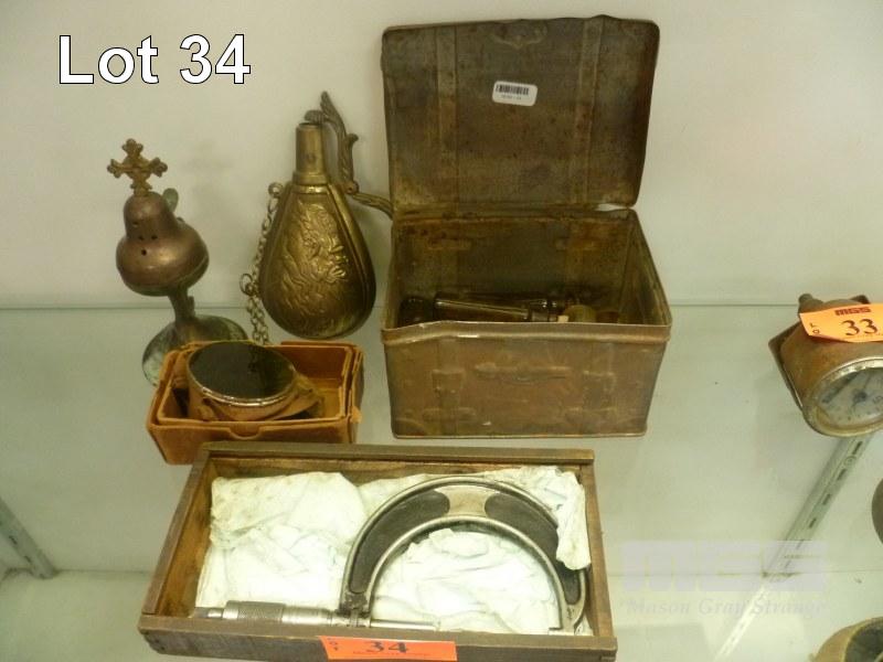 VINTAGE CURIOS INCLUDING BROWN & SHARP CALIPERS, WELDING GOGGLES, GLASS VIALS, GUNPOWDER POUCH, INCENSE HOLDER