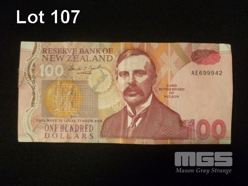 RESERVE BANK OF NEW ZEALAND, $100 PAPER BANKNOTE, AE 699942 (SIGNS OF REPAIR - TOP LEFT CORNER)