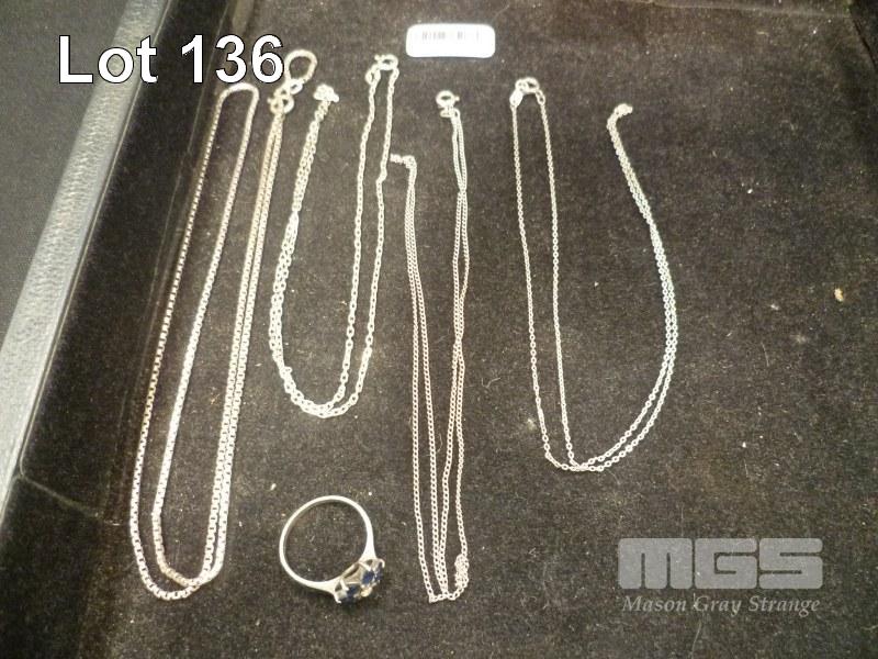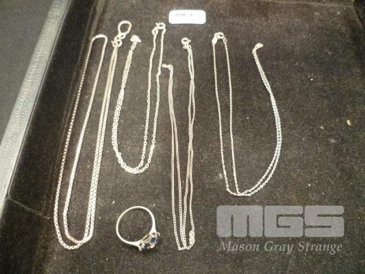 4 x SILVER NECKLACES, (1 REQUIRES REPAIR) & SILVER RING SET WITH 6 x SAPPHIRES
