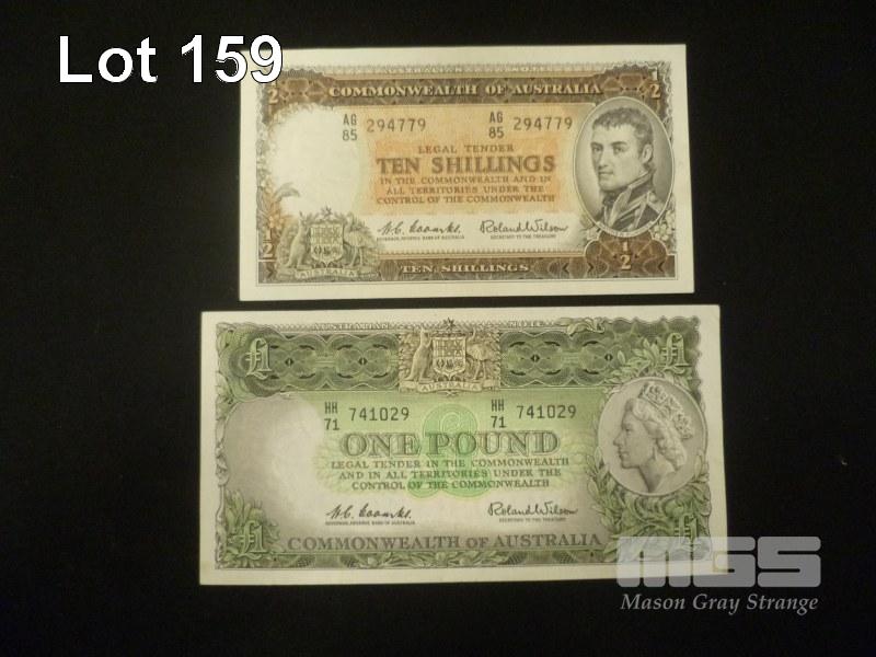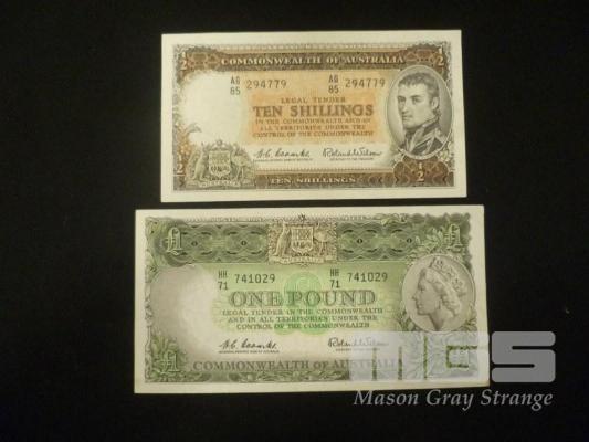 2 X COMMONWEALTH OF AUSTRALIA, BANK NOTES, INC; TEN SHILLINGS, COOMBS/WILSON, AG85 294779 ONE POUND, COOMBS/WILSON, HH71 741029