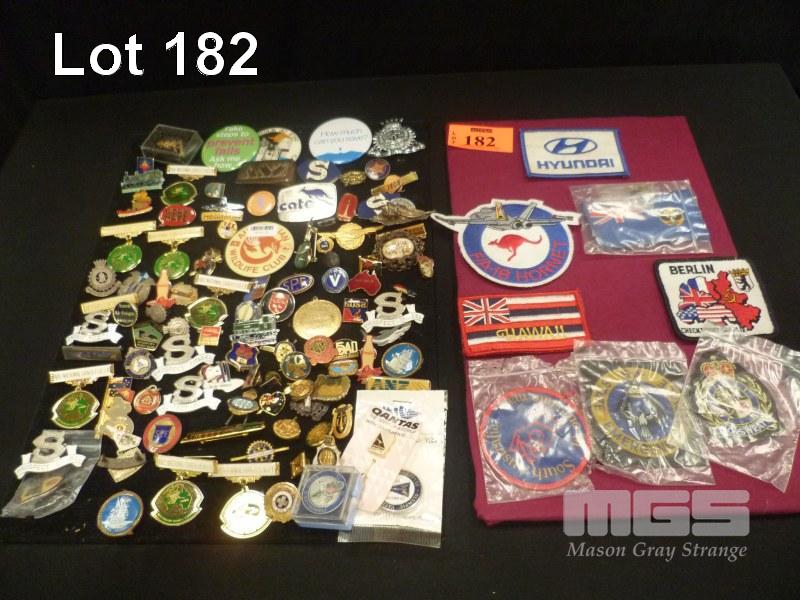 ASSORTED CLOTH BADGES, PINS, BUTTON BADGES, ETC