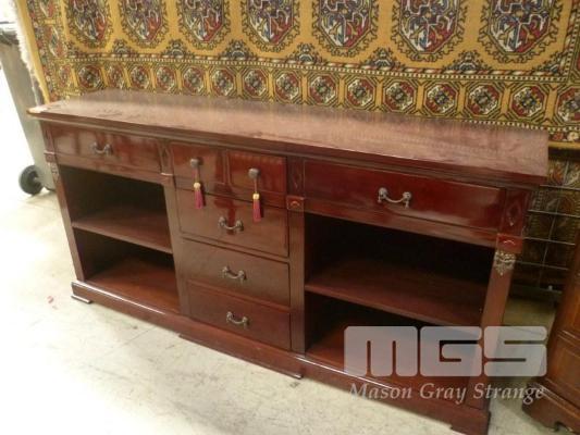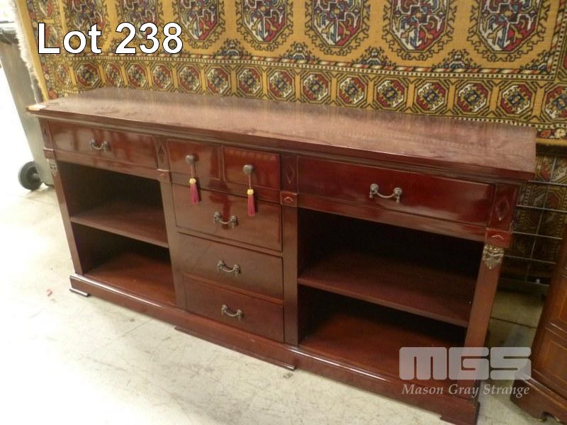 WOHLERS MAHOGANY HIGH GLOSS DINING ROOM BUFFET UNIT, 7 DRAWER WITH SIDE SHELF COMPARTMENT, BRASS HANDLES & FEATURES