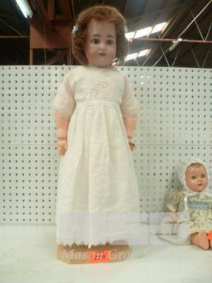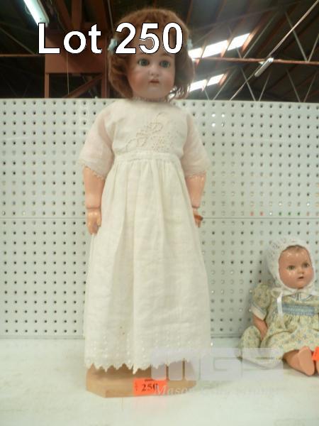 SIMON & HALBIG VINTAGE BISQUE FACED DOLL ON DISPLAY STAND WITH GLASS EYES, BALL JOINT BODY INCLUDING LACE DRESS, BRACELET & SHOES
