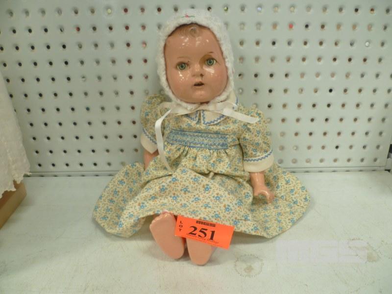 VINTAGE RELIABLE CELLULOID BABY DOLL, MADE IN CANADA, SLEEP EYES, MOVING LIMBS, FLORAL LINEN DRESS & KNITTED BONNET