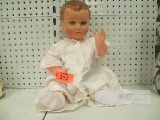 VINTAGE PLASTIC BABY DOLL, MARKED PCP FRANCE 50 IN LINEN DRESS & BOOTIES, SLEEP EYES & MOVING LIMBS