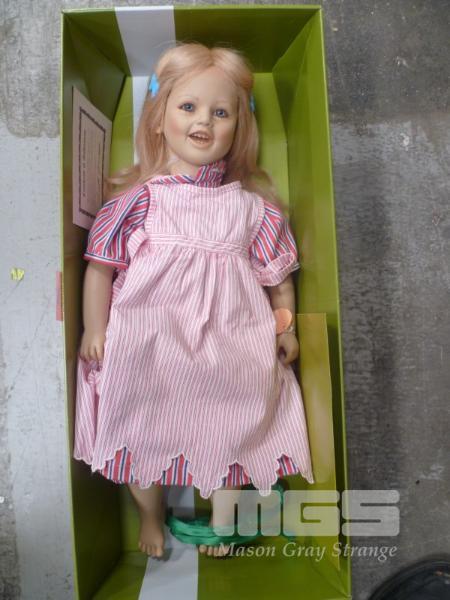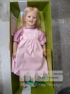 ANNETTE HIMSTEDT PUPPEN KINDER, LISA DRESS DOLL ON DISPLAY STAND, 2'2" (H), WHITE/RED STRIPED DRESS, NEW IN BOX