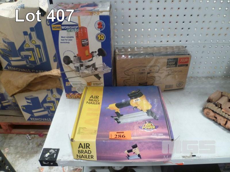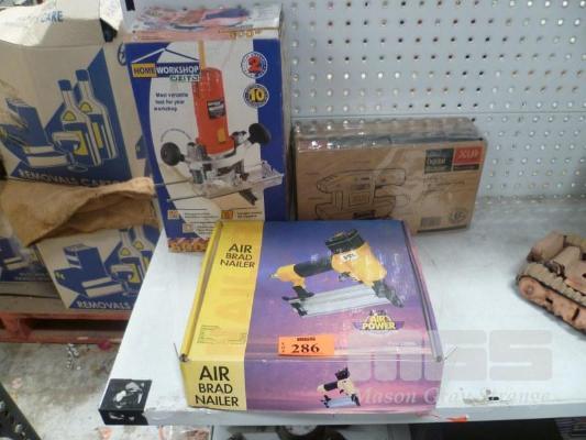 OZITO PLUNGE ROUTER, 6.35mm, XU1 ORBITAL SANDER & SUPERWORKS AIR BRAD NAILER
