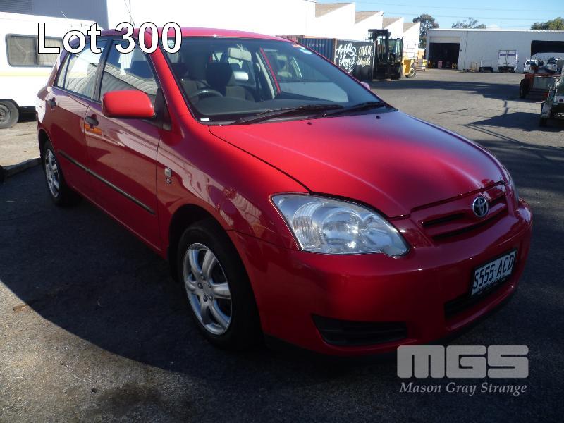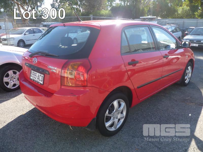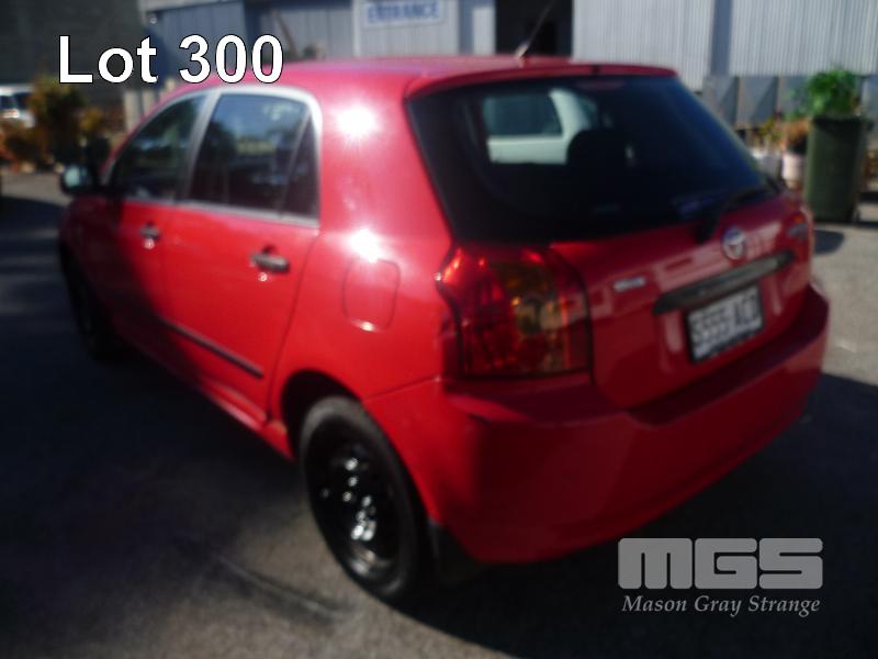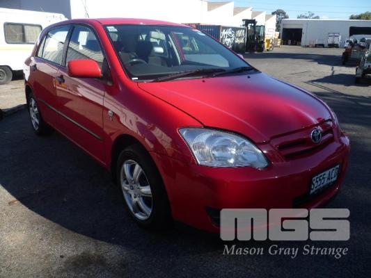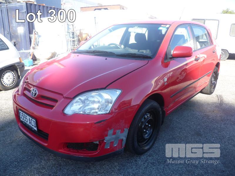 2006 TOYOTA COROLLA SECA LEVIN HATCH REG: S555 ACD (SA) VIN: JTDKR22E502047077 ODO: 125,991kms SHOWING 1.8 LITRE, 4 CYLINDER, 4 SPEED AUTOMATIC TRANSMISSION, PETROL, RED DUCO, 4 DOORS, 5 SEAT, AIR BAG, AIR CON, CD PLAYER, CENTRAL LOCKING, POWER STEERING, SPARE WHEEL (WITH 4 KEY/S) CONDITION: PASSENGER SIDE - LARGE SCRAPE DOWN ENTIRE SIDE DRIVERS SIDE - MIRROR, BROKEN GLASS