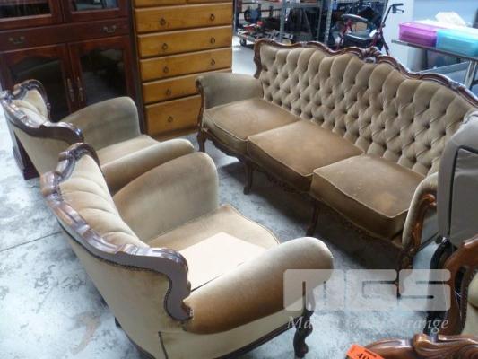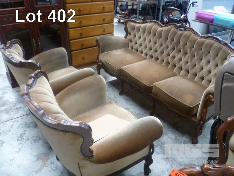 BEIGE VELVET 3 PIECE LOUNGE SUITE, ORNATE CARVED, DEEP BUTTON, ROLL ARM, 3 SEATER & 2 x SINGLES