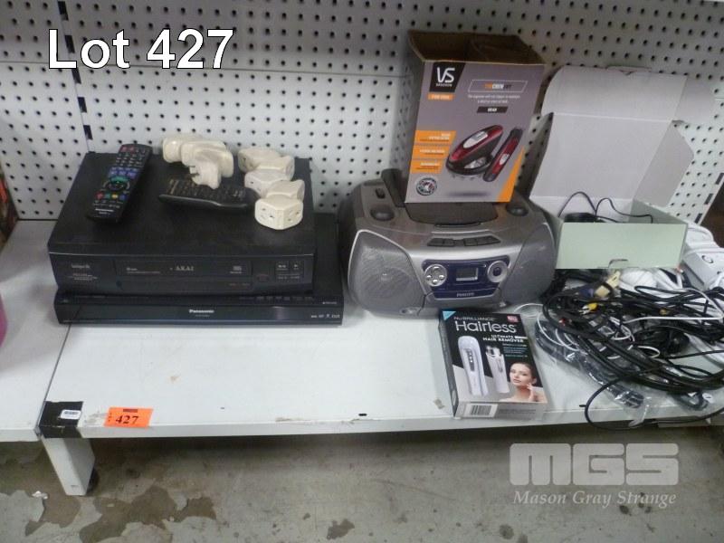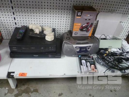 PANASONIC DVD RECORDER & AKAI VCR WITH REMOTES, PHILIPS PORTABLE STEREO, HAIR REMOVERS & CABLES