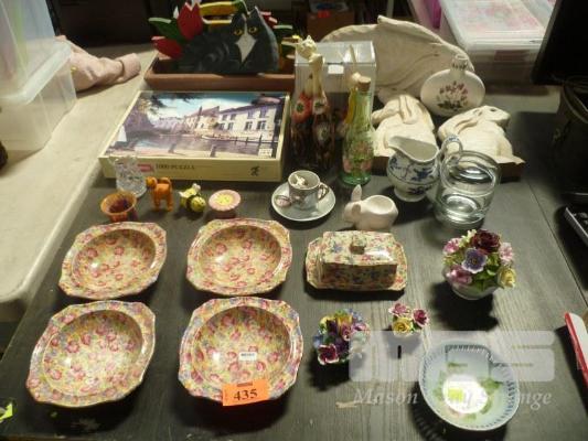 ROYAL WINTON BOWLS & BUTLER DISH, COALPORT & STAFFORDSHIRE FINE CHINA FLOWERS & TIMBER RABBITS, ETC