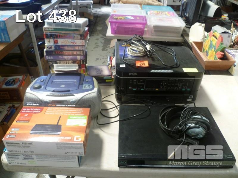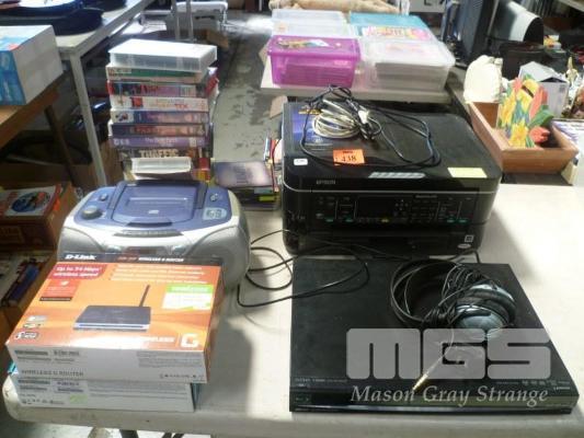 PANASONIC BLU-RAY (NO REMOTE), EPSON PRINTER, PORTABLE STEREO, VHS TAPES, ETC
