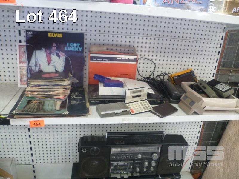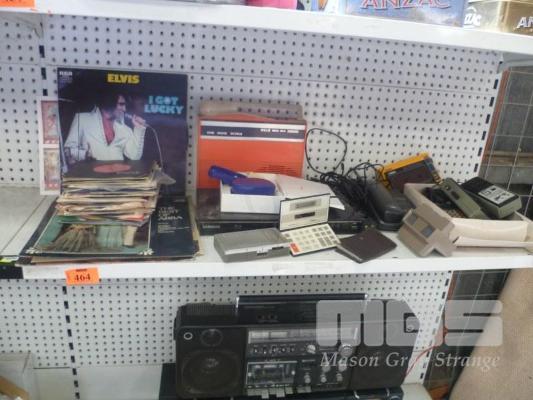 RETRO CALCULATORS, PORTABLE CASSETTE PLAYER, THE SOUND MASTER PORTABLE RECORD PLAYER, SAMSUNG BLU RAY, NO REMOTE, ALBUMS, SINGLES, ETC