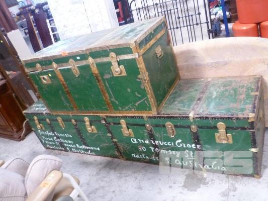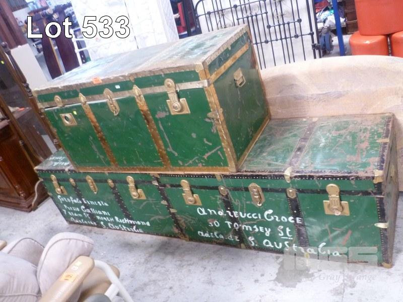 3 x GREEN METAL VINTAGE TRAVEL TRUNKS