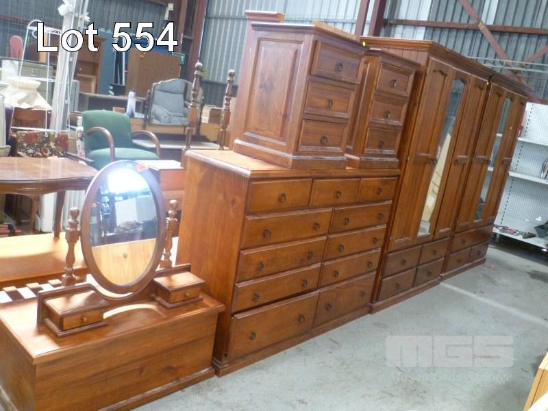 PINE 7 PIECE BEDROOM SUITE INC PAIR WARDROBES, PAIR BEDSIDE CABINET, WIDE CHEST OF 11 DRAWERS, BLANKET BOX & VANITY MIRROR