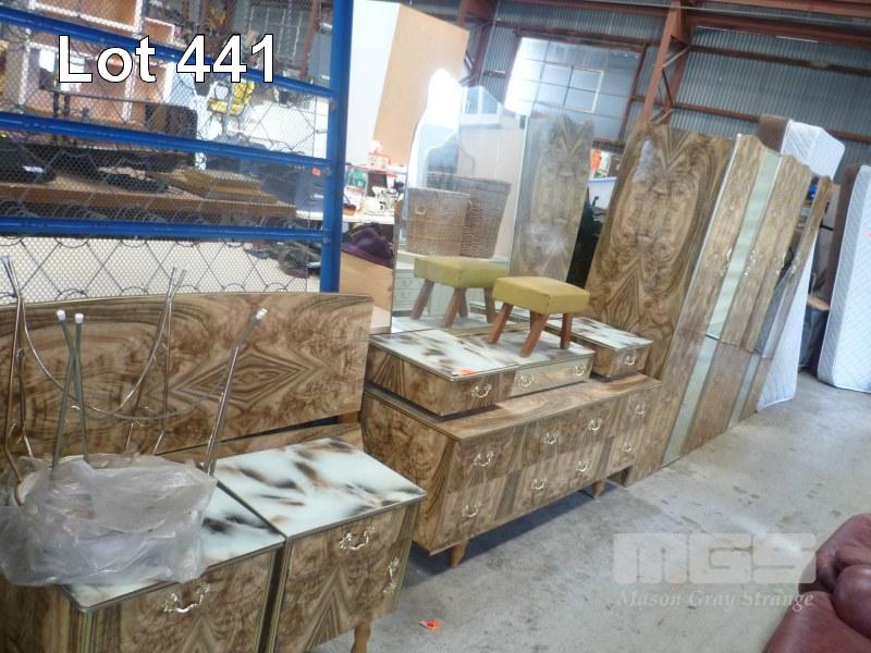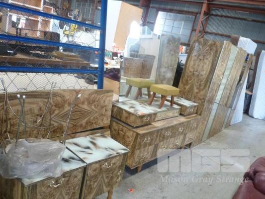 TIMBER LAMINATE, MID CENTURY 5 PIECE BEDROOM SUITE, INC PAIR WARDROBES, DRESSER, BEDSIDE CABINETS & DOUBLE BED FRAME