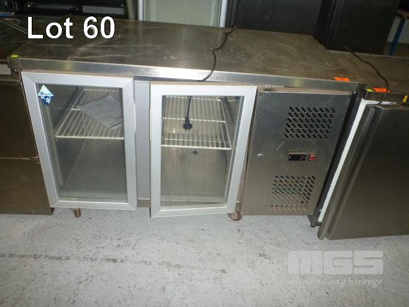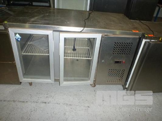 COUNTER DISPLAY FRIDGE, 2 DOOR, 135cm STAINLESS STEEL CASED SELF CONTAINED UNIT, 240V ON CASTORS (TOP SCRATCHED)