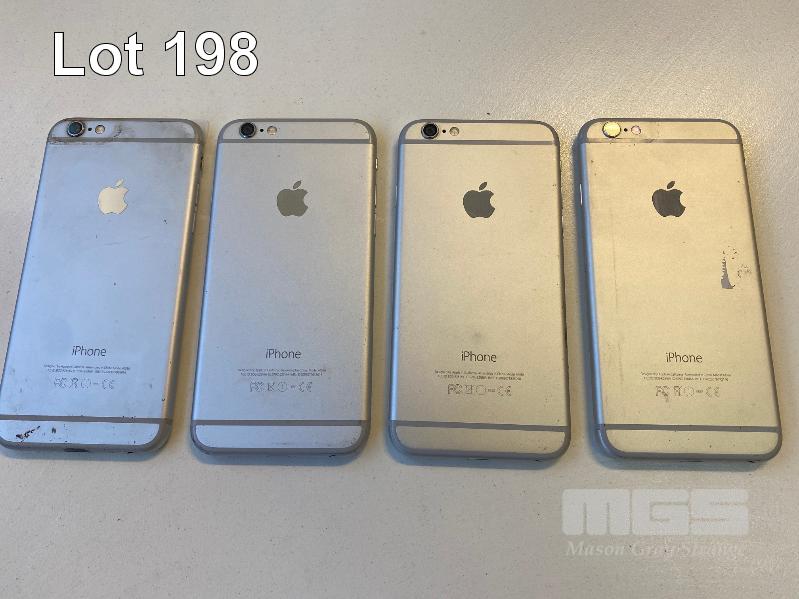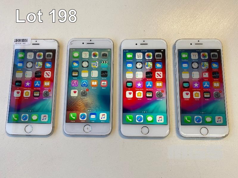 4 x APPLE iPHONE 6, 16GB, SILVER, MODEL A1586 (NOTE: ALL HAVE VARIOUS DAMAGE, 1 x WITH SCREEN BLEMISHES) (NO CHARGERS, NO CABLES) S/N:F1GPX4XDG5MP, DNRPVRW0G5MP, DNPPW4FYG5MP, F17PX4C6G5MP