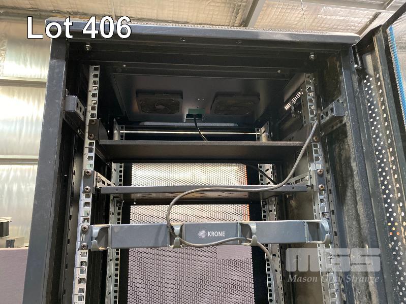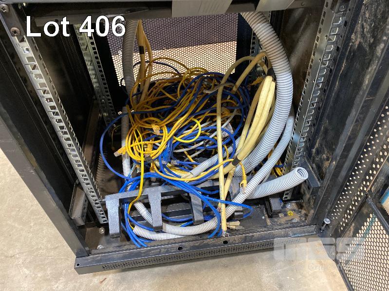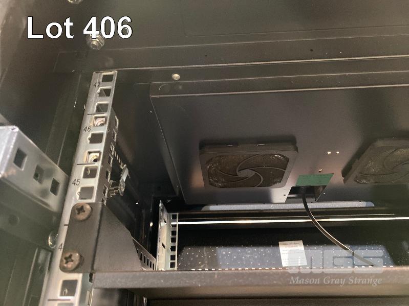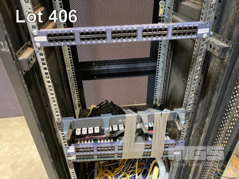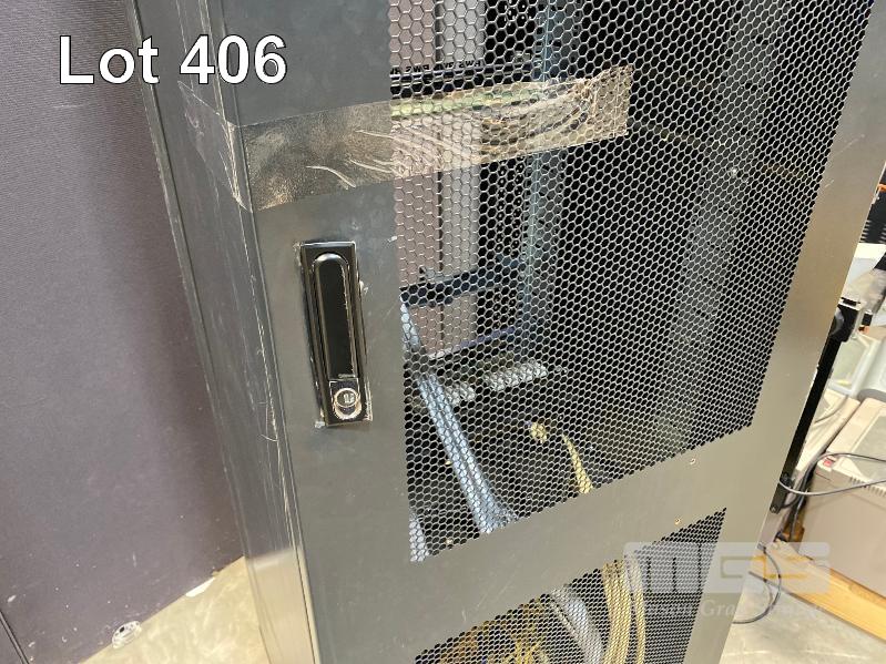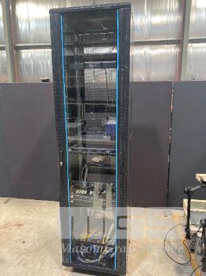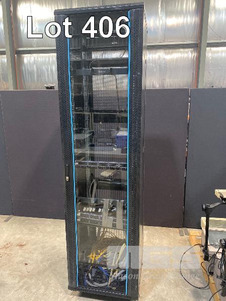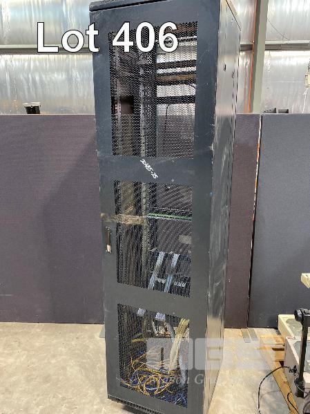 DATA RACK CABINET, RACK WORLD, 47U, 226cm HIGH x 60cm WIDE x 60cm DEEP, GLASS FRONT PANEL, PATCH PANELS, COOLING FANS (NOTE: DAMAGED REAR DOOR HANDLE AREA)