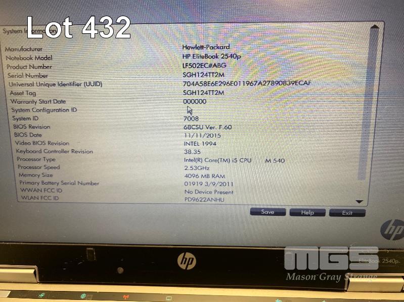 LAPTOP, HP ELITEBOOK 2540p (LF502EC), CORE i5 M540 @ 2.53GHz, 4GB DDR3 RAM, 250GB SATA HDD, 12.1" WIDESCREEN (1280x800), INTEL HD VIDEO, Wi-Fi, BLUETOOTH, WINDOWS 10 PRO INSTALLED & POWER SUPPLY (NO OPTICAL DRIVE) (NOTE: DAMAGE TO CASING) S/N:SGH124TT2M