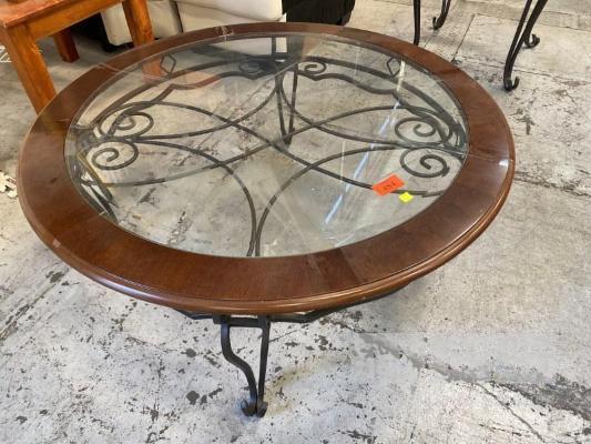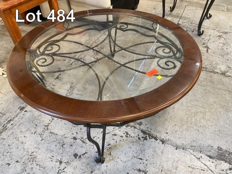 COFFEE TABLE, 105cm DIAMETER, GLASS INLAY, IRON FRAME